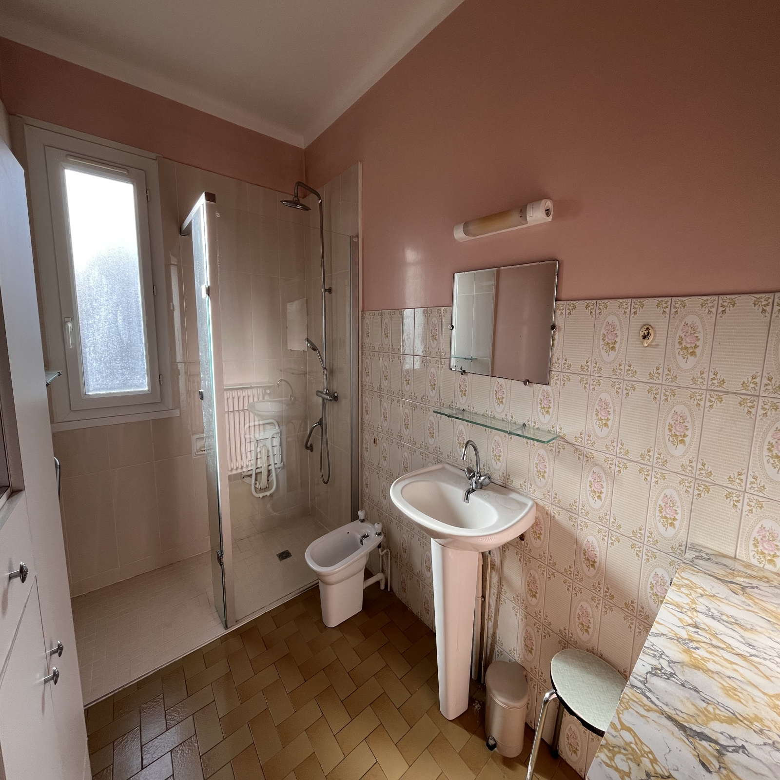 À l'étage : un palier-dégagement dessert un salon-séjour traversant et lumineux avec un accès balcon, une cuisine séparée avec possibilité d'ouverture sur la pièce de vie (pour une surface de 40 m2), un WC indépendant, une salle d'eau et 2 grandes chambres avec placards.